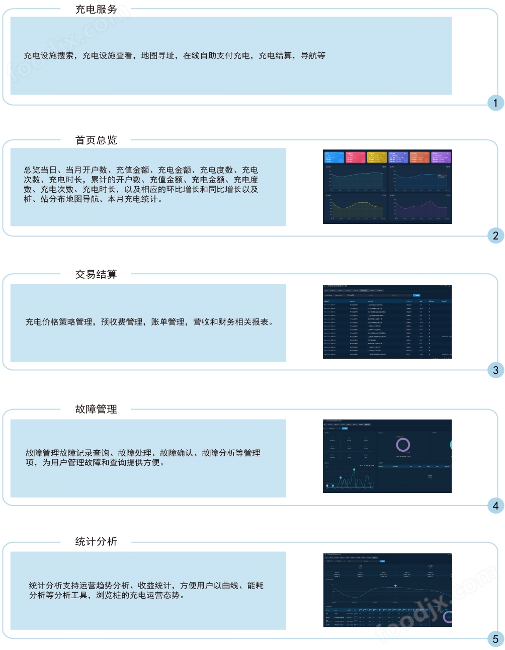 5、智能化管理:系统可对充电桩进行远程管理,包括远程开关机、故障报警等,确保充电设施的正常运行。