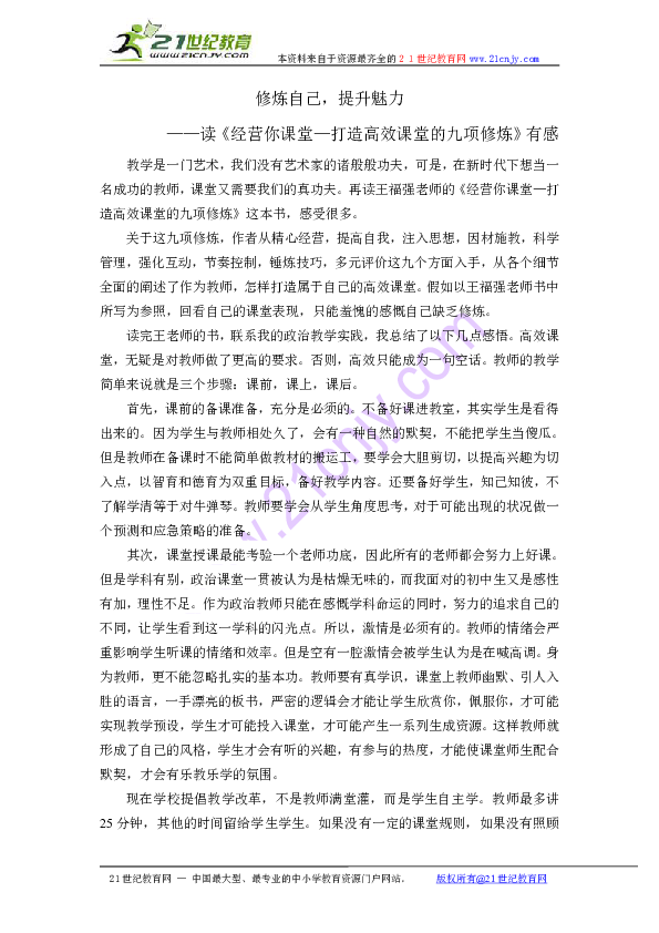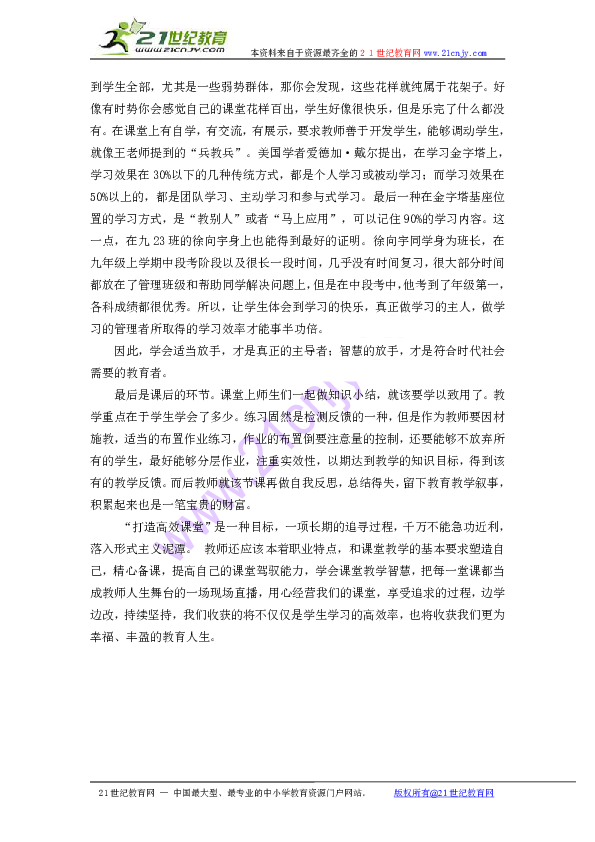 此外,作者还提到了教师应具备的沟通能力。他认为,教师与学生之间的良好沟通是提高课堂效率的关键。教师应善于倾听学生的意见,关注学生的心理需求,从而更好地调整教学策略,提高课堂效果。